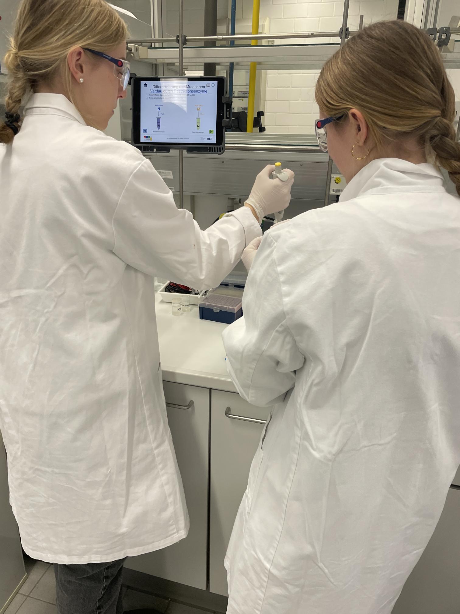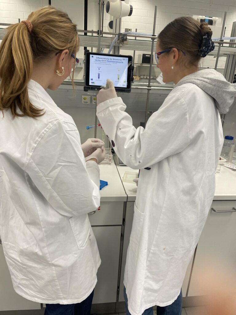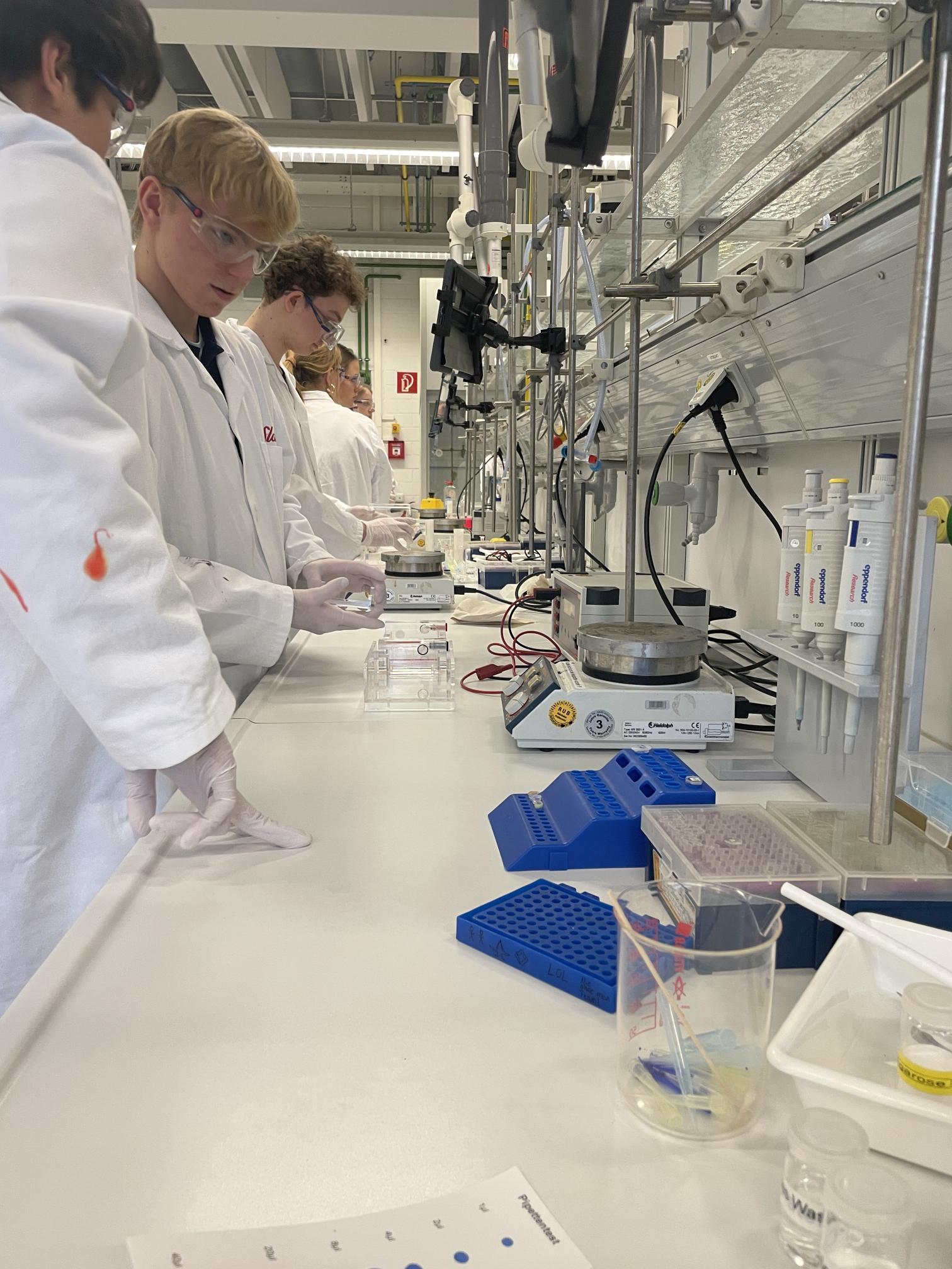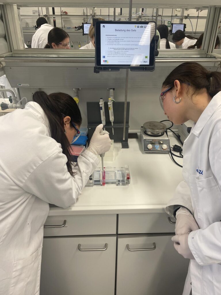 Im Rahmen des Projekts Molekulargenetik und Evolution erhielten die Schüler*innen spannende Einblicke in moderne molekularbiologische Methoden. Sie führten selbstständig eine DNA-Extraktion durch, arbeiteten mit der Polymerase-Kettenreaktion (PCR) und werteten Ergebnisse mithilfe der Gel-Elektrophorese aus. Anhand der Analyse eigener Mundschleimhautzellen konnten evolutionäre Zusammenhänge und die Ausbreitung des modernen Menschen nachvollzogen werden.